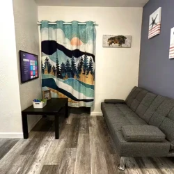 Acogedora sala de estar: relájate en un espacio acogedor con cómodos asientos y TV de pantalla plana.