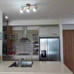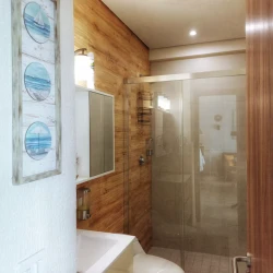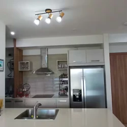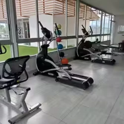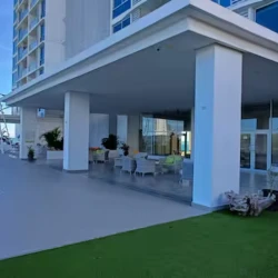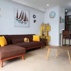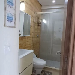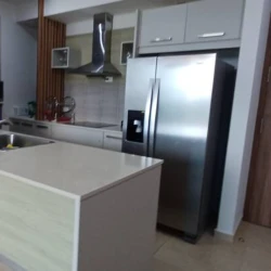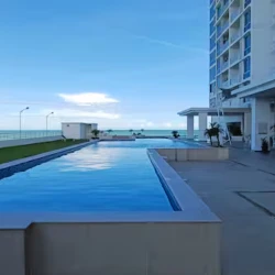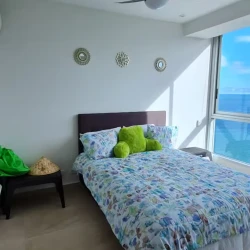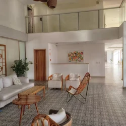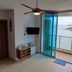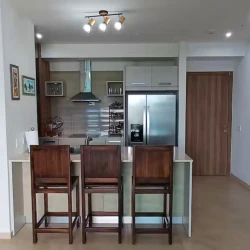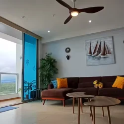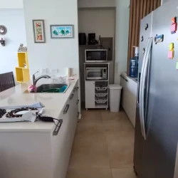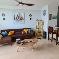 Este acogedor apartamento frente al mar está diseñado para brindarte el máximo confort durante tu estadía. Cuenta con dos habitaciones luminosas y bien decoradas, donde el descanso está garantizado gracias a sus cómodas camas, incluyendo una king-size y dos individuales con ropa de cama de alta calidad. La sala de estar es un espacio amplio y agradable, con sofás ideales para relajarte después de un día de playa, acompañados de una decoración moderna que te hará sentir como en casa. El comedor, con capacidad para seis personas, es perfecto para disfrutar de comidas en compañía, mientras que la cocina, completamente equipada, te permite preparar desde un desayuno sencillo hasta una cena especial sin ningún problema. Además, el apartamento cuenta con una piscina que se convierte en el lugar ideal para refrescarte y relajarte en cualquier momento del día, mientras disfrutas del ambiente tropical que lo rodea.